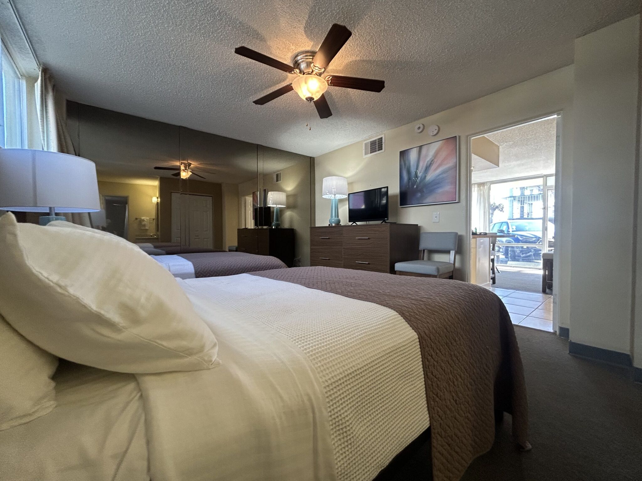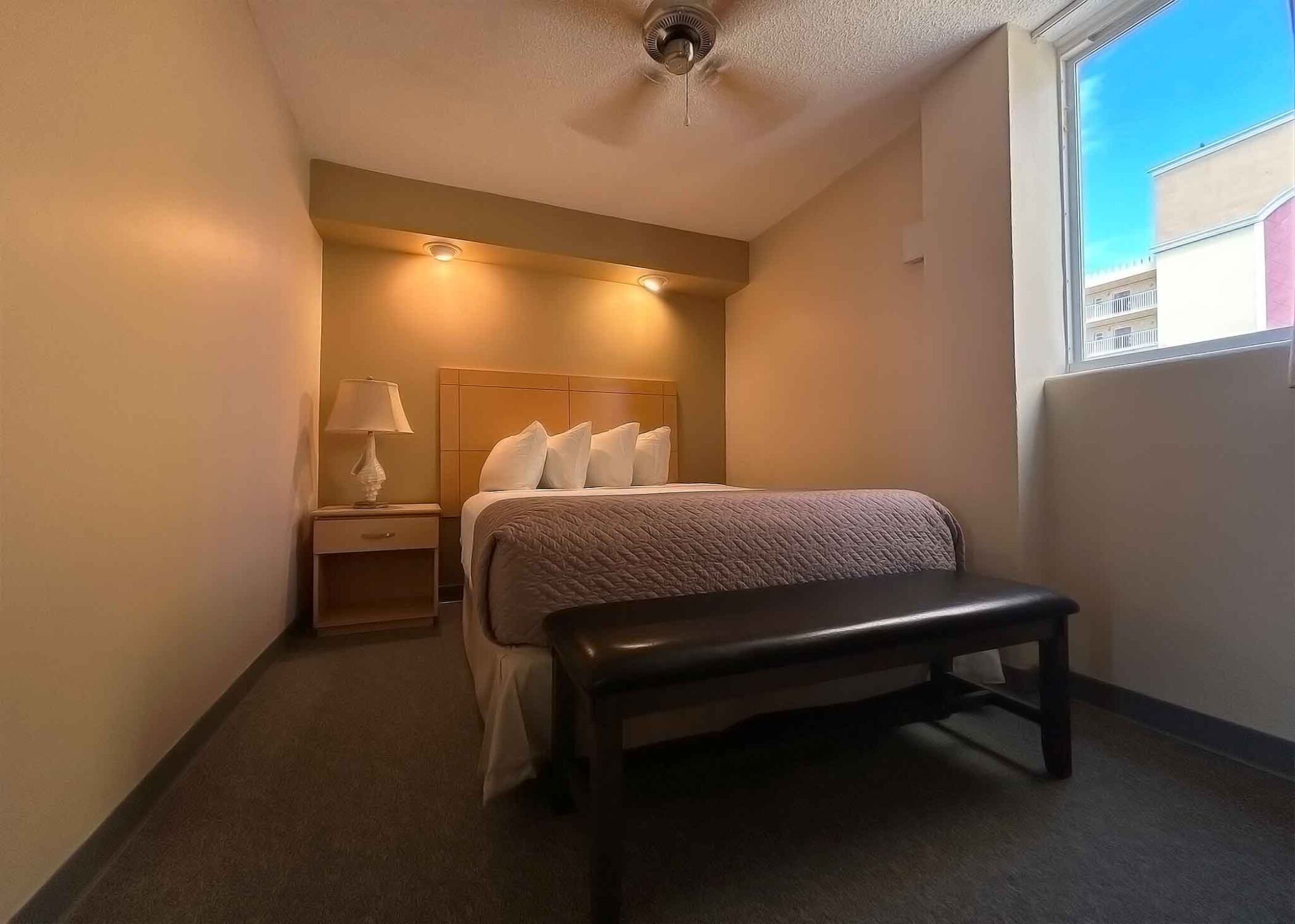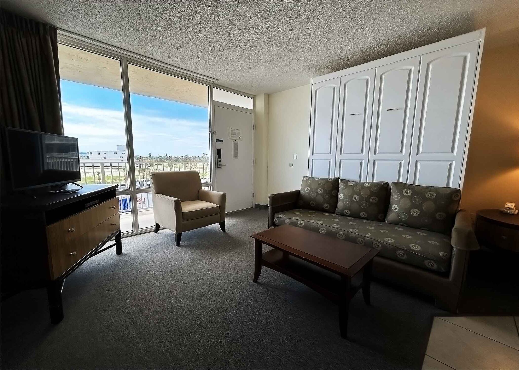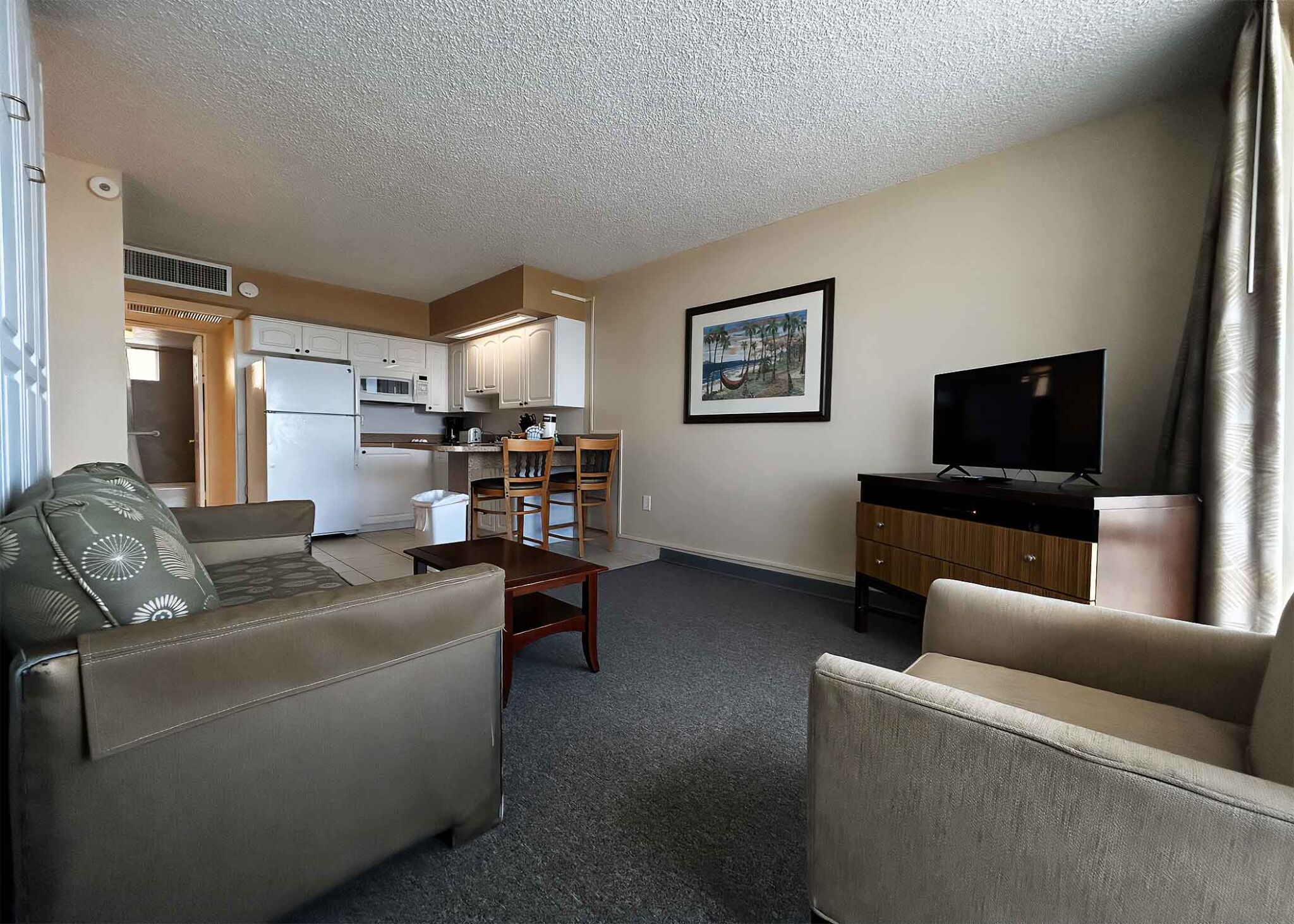 Every room at Outrigger Beach Club boasts an amazing view of the Atlantic Ocean due to the resort's boomerang layout . The Outrigger offers studio, efficiency, and one-bedroom timeshare accommodations. Studio units sleep two and offer a queen sleeper sofa. Efficiency units sleep four and feature a queen Murphy bed and full-size sleeper sofa. One-bedroom units sleep six and feature two full-size beds and a queen sleeper sofa. All timeshare units are equipped with a kitchen that includes a refrigerator, stove top, convection microwave oven and coffee maker.