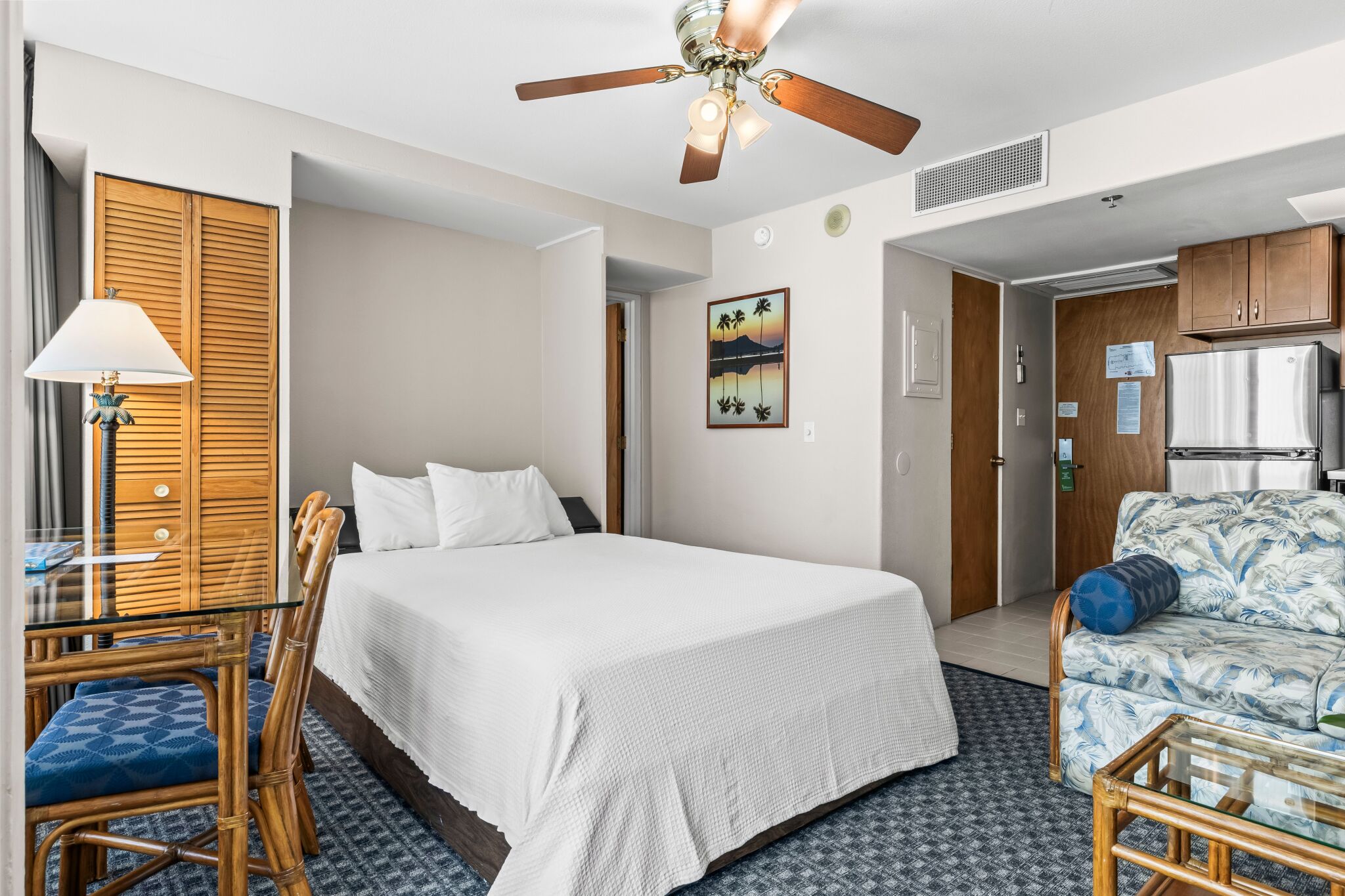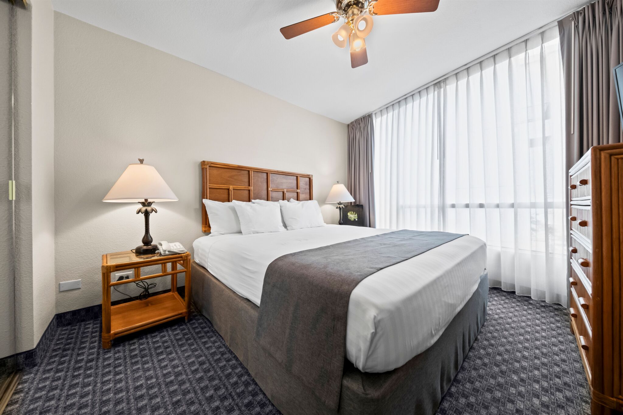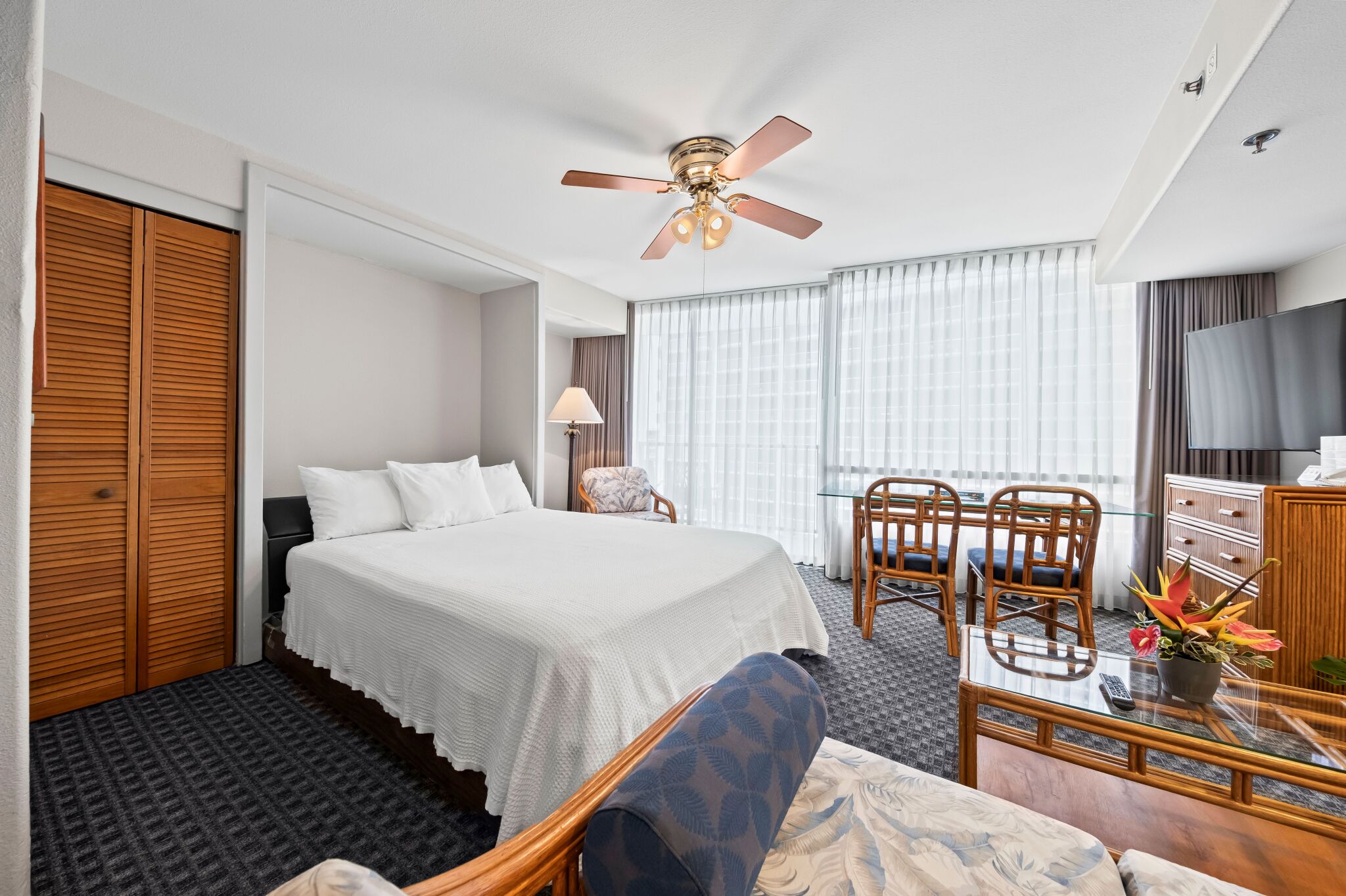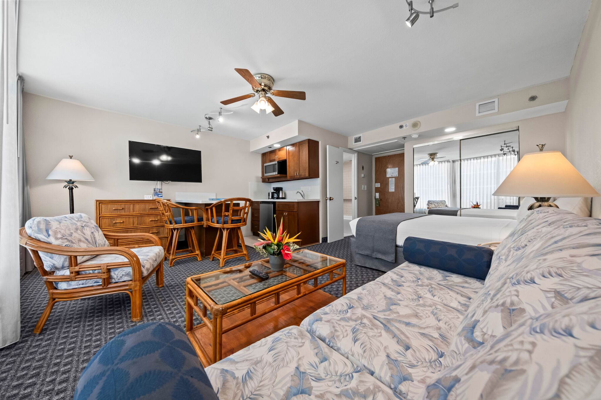 The resort offers five room types, from studio suites to spacious two-bedroom, two-bath suites, all styled with a relaxed tropical island decor. Each accommodation includes either a mini kitchenette or full kitchen with a microwave, refrigerator, coffee maker, electric kettle, toaster, and stocked plates, silverware, glassware, and cooking utensils. Additional items such as blenders, rice cookers, air fryers, and electric skillets are available upon request. Suites offer modern amenities including complimentary Wi-Fi, flat-screen smart TVs, air conditioning, an in-room safe, telephone, and alarm clock. All units include a hairdryer, iron and ironing board, and complimentary bath essentials. Many suites feature private lanais, with rollaway beds and cribs available to rent upon request.