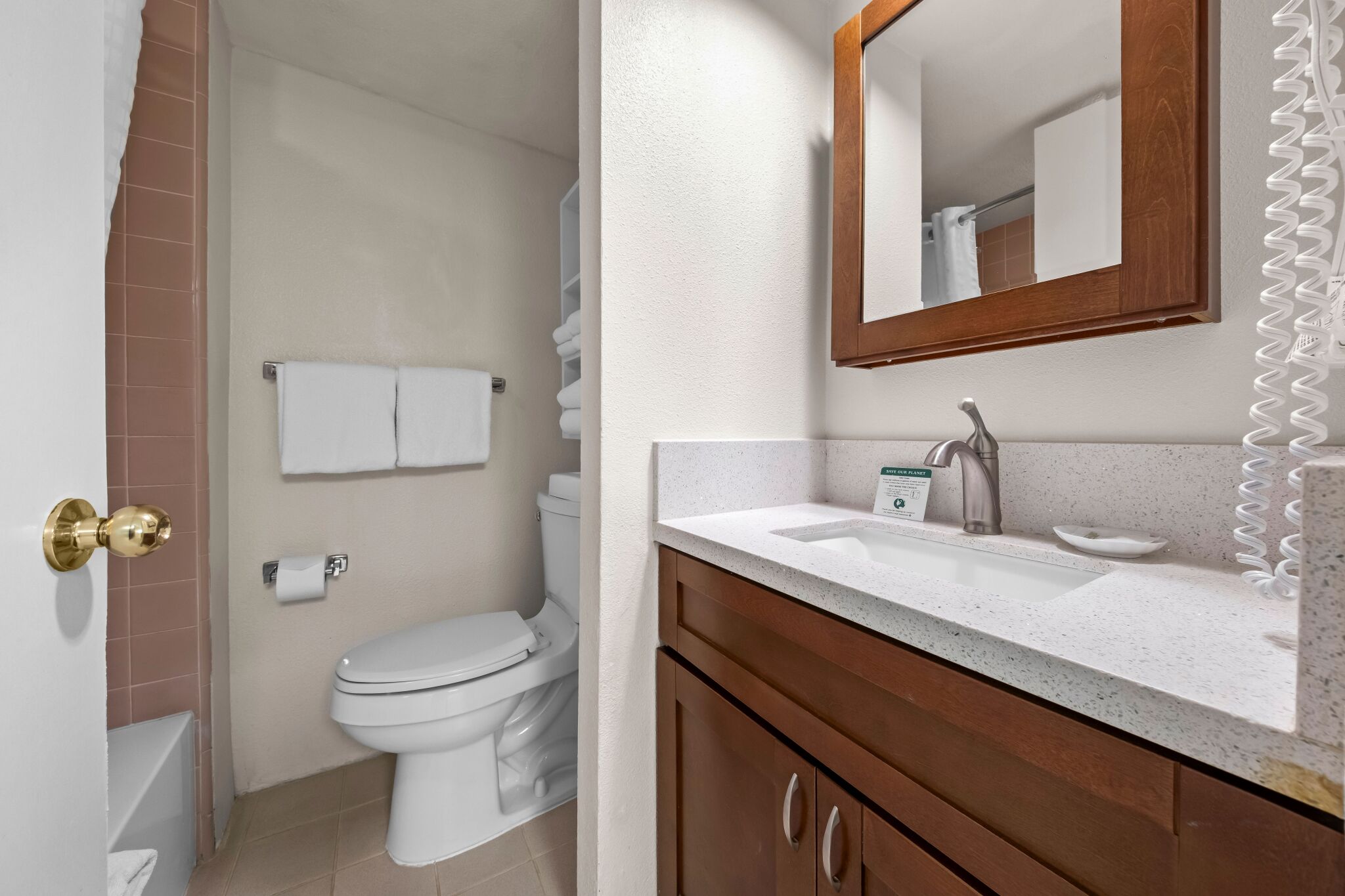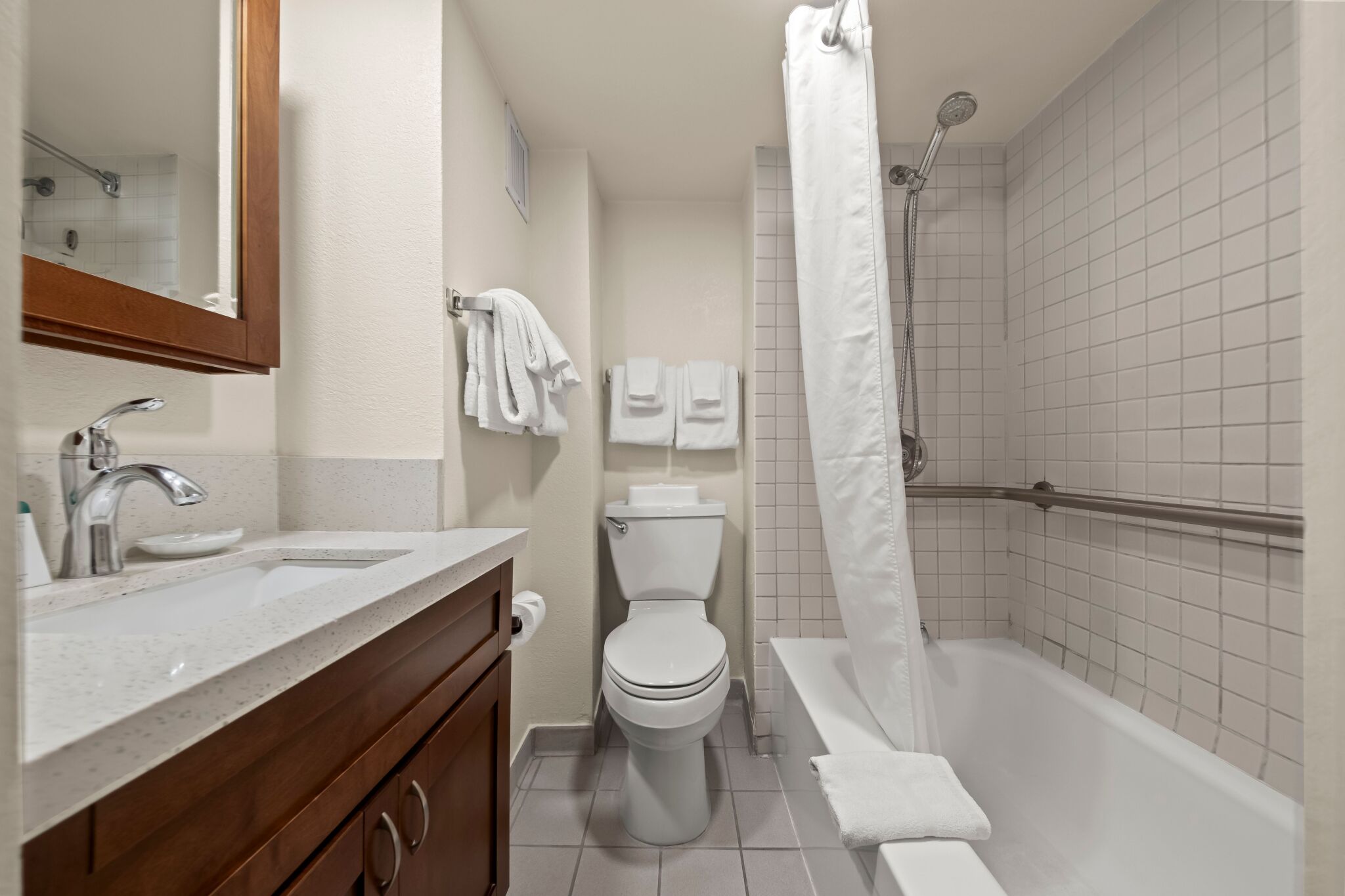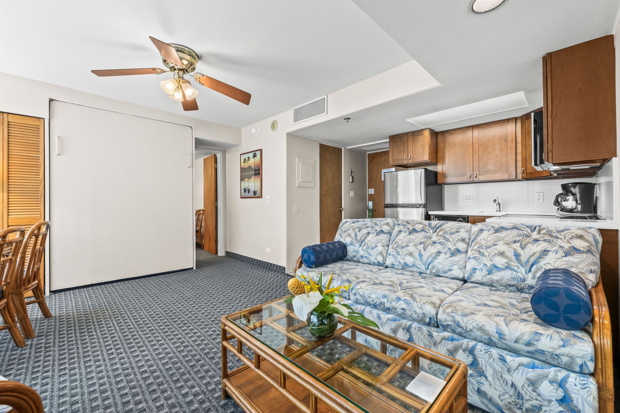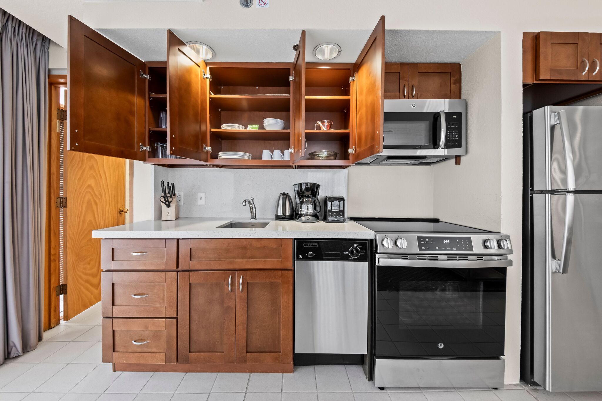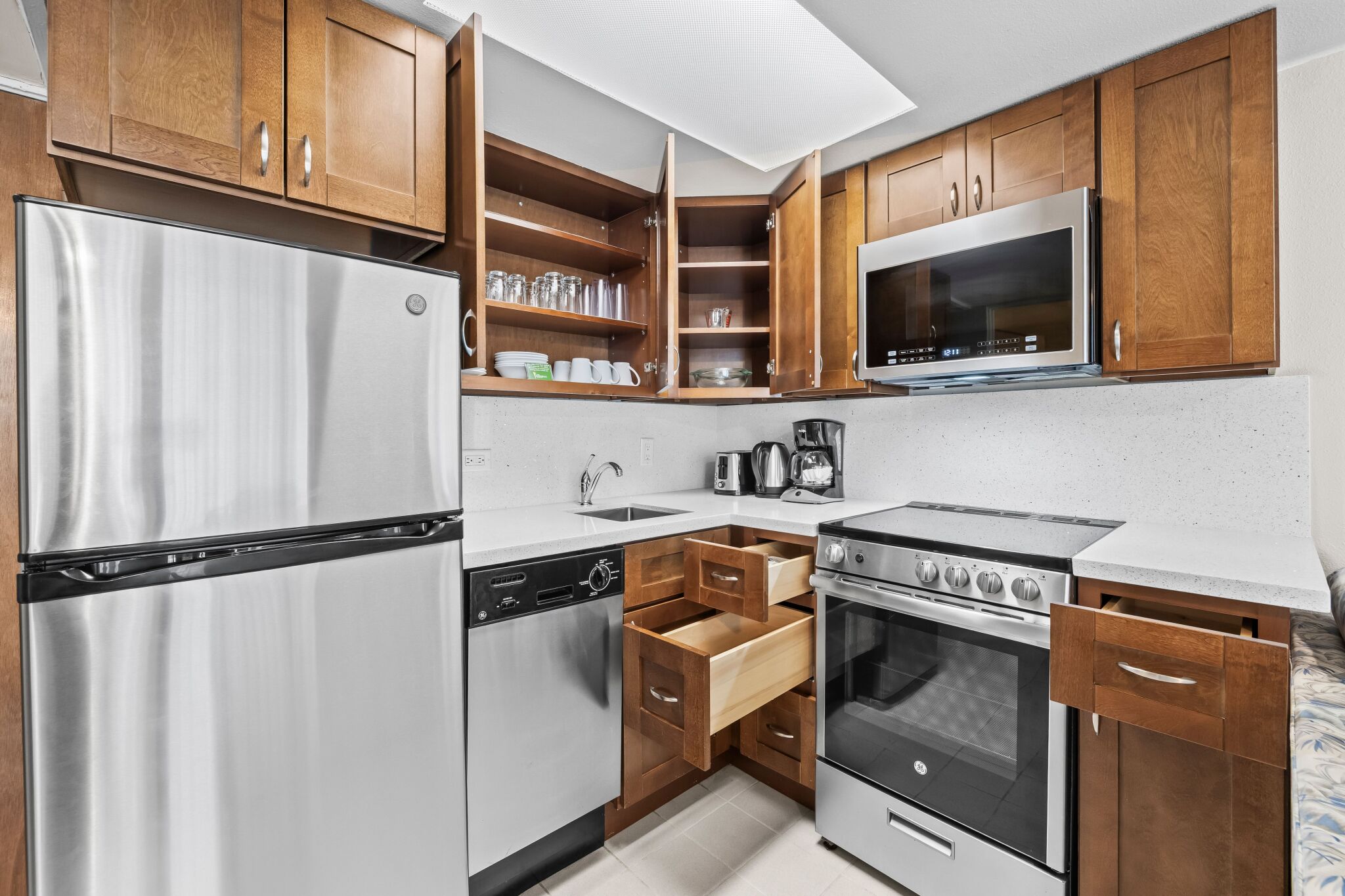 The resort offers five room types, from studio suites to spacious two-bedroom, two-bath suites, all styled with a relaxed tropical island decor. Each accommodation includes either a mini kitchenette or full kitchen with a microwave, refrigerator, coffee maker, electric kettle, toaster, and stocked plates, silverware, glassware, and cooking utensils. Additional items such as blenders, rice cookers, air fryers, and electric skillets are available upon request. Suites offer modern amenities including complimentary Wi-Fi, flat-screen smart TVs, air conditioning, an in-room safe, telephone, and alarm clock. All units include a hairdryer, iron and ironing board, and complimentary bath essentials. Many suites feature private lanais, with rollaway beds and cribs available to rent upon request.