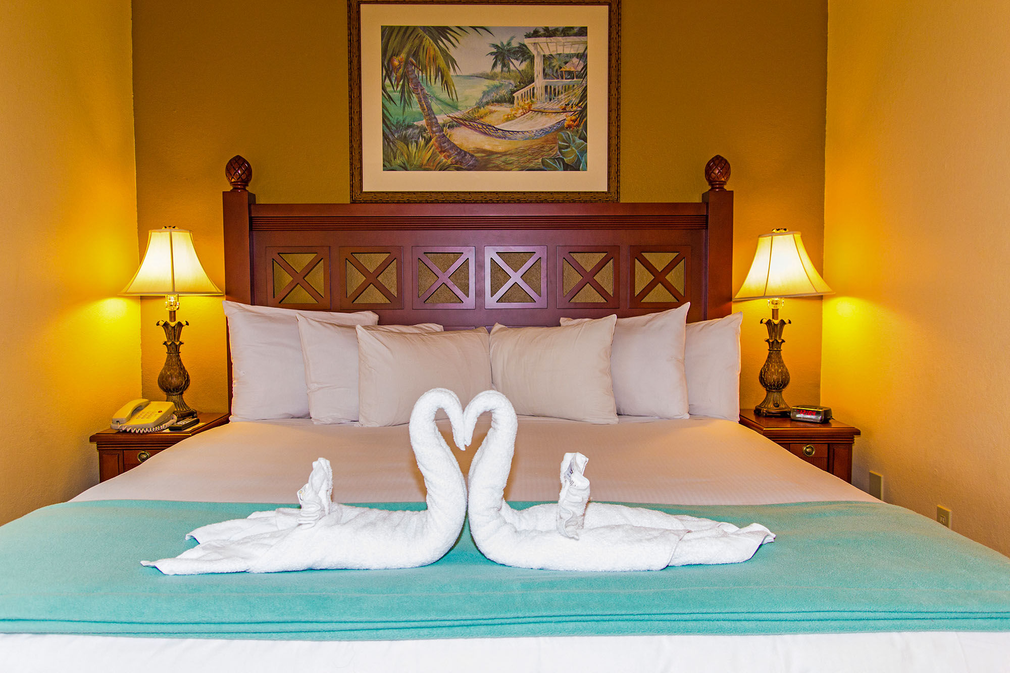 One-bedroom and two-bedroom timeshare villas are equipped with a full kitchen including dishwasher and microwave, washer/dryer and air-conditioning. One- bedroom villas sleep four, and two-bedroom villas sleep six with a queen bed in the master bedroom, two full-size beds in the second bedroom, and a queen sleeper sofa in the living area.