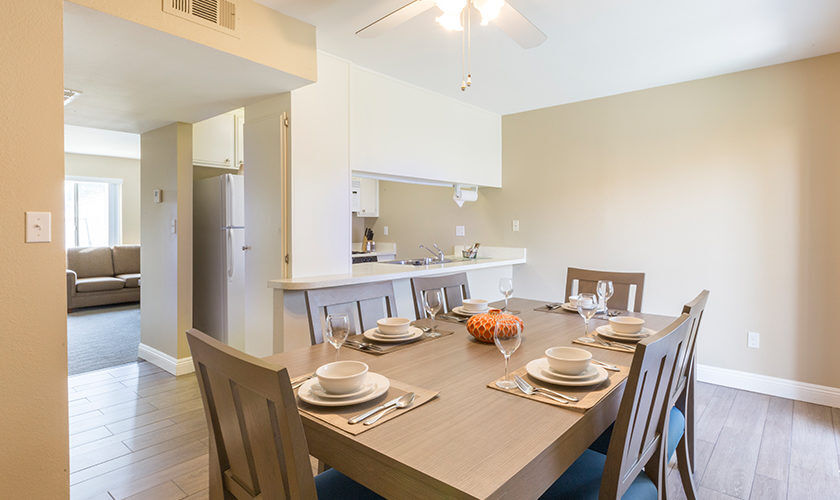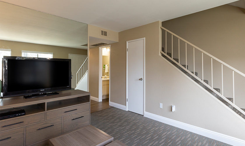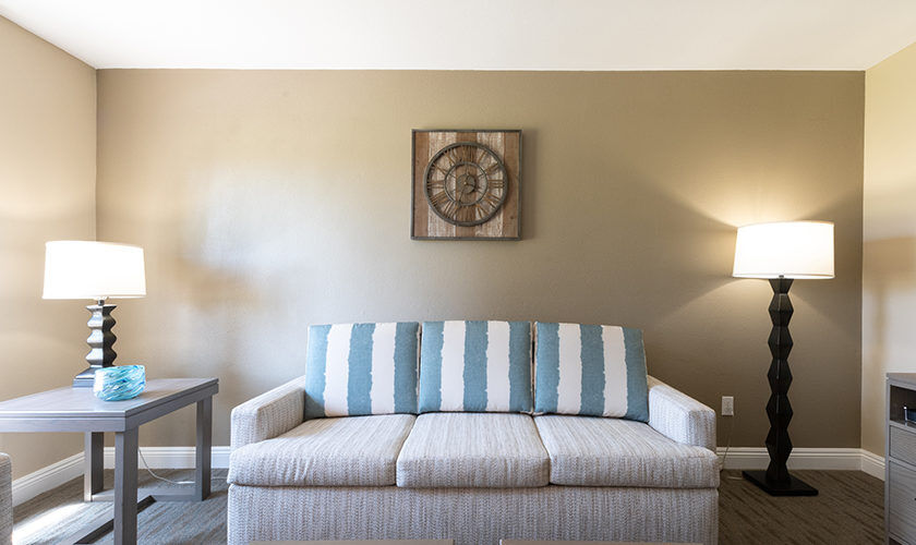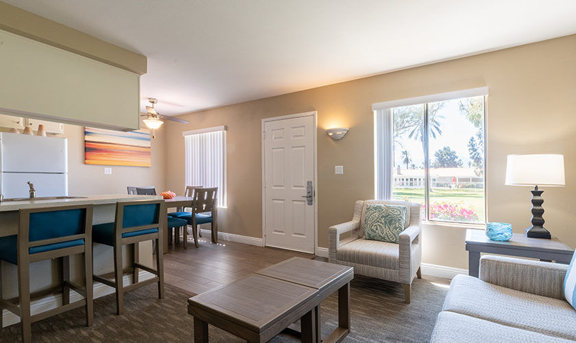Featuring roomy one and two-story villas, Indian Palms Vacation Club is the perfect retreat for those looking for relaxing escape from life's hustle and bustle. Each two bedroom unit features a queen bed in the master bedroom, two twin beds in the guest bedroom, a sleeper sofa in the living area, a fully equipped kitchen, and central air conditioning and heating.