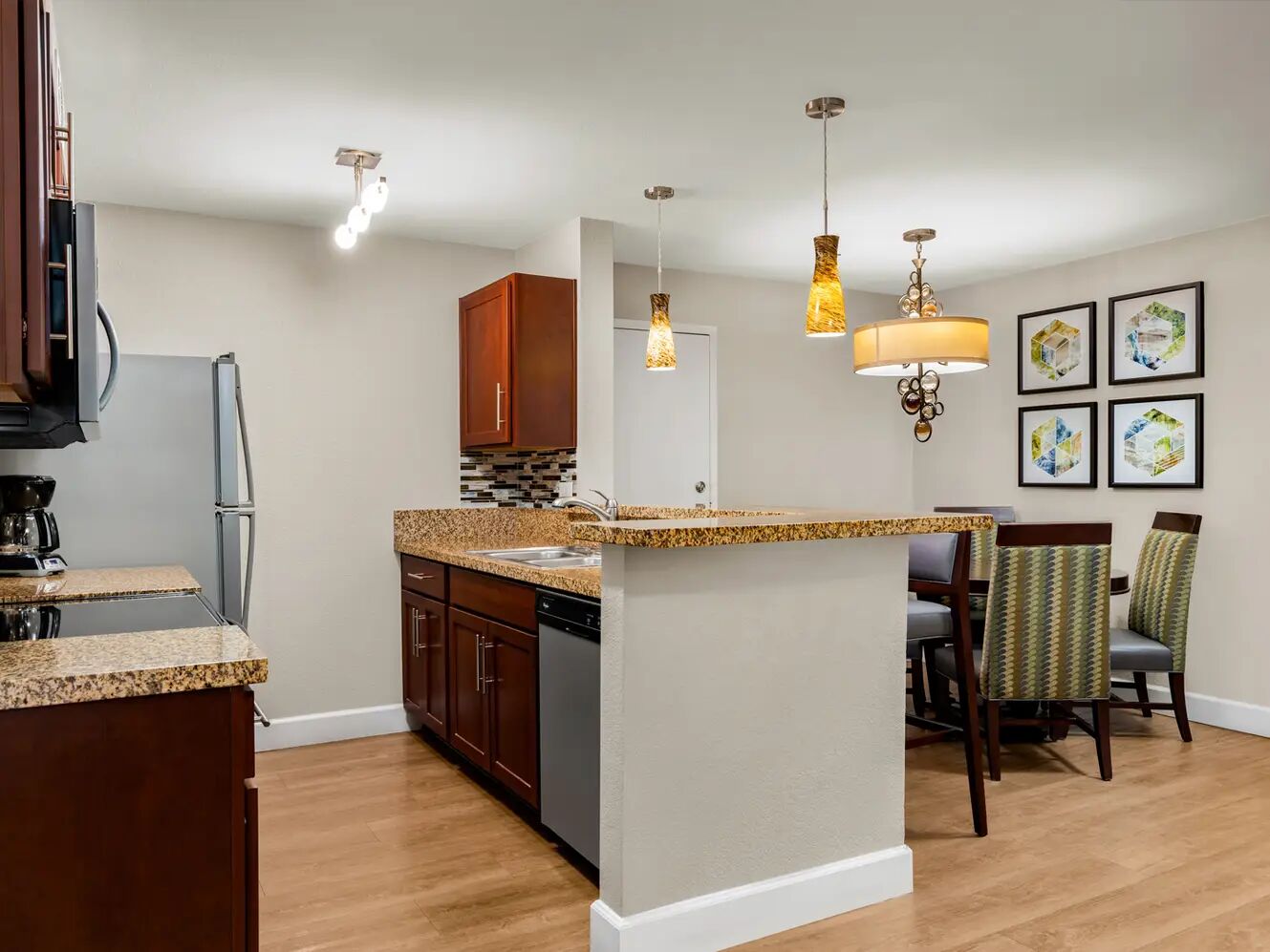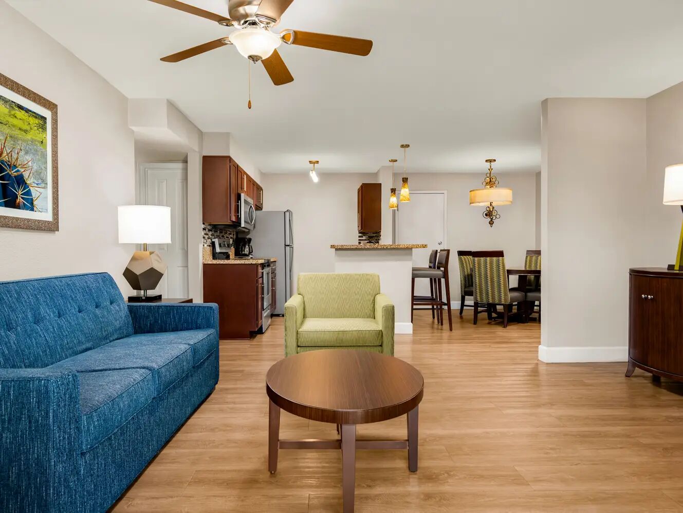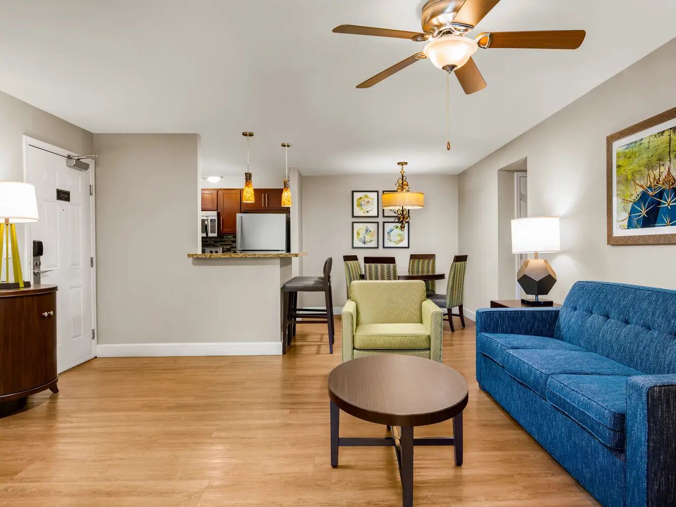 The Desert Club Resort's 19.5 acres house over 600 one and two-bedroom suites. Each suite offers a full kitchen, air conditioning, cable TV telephone, wireless internet, fireplace, washer/dryer and private balcony or terrace. Keeping in step with the resort's theming, rooms are decorated with warm, sun-drenched earth tones and exquisite furniture. Touches of glossy, dark woods and marble accent the experience.