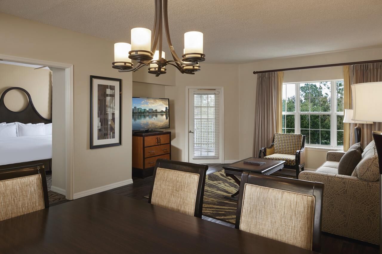 Hilton Grand Vacations at SeaWorld offers studio units as well as one-bedroom and two- bedroom suites. Studios offer a kitchenette and all the essentials, while suites provide a full kitchen, dining area, living area, soaking tub in master bathroom, walk-in shower and in-suite washer and dryer. Some studios and all suites also offer a balcony.
