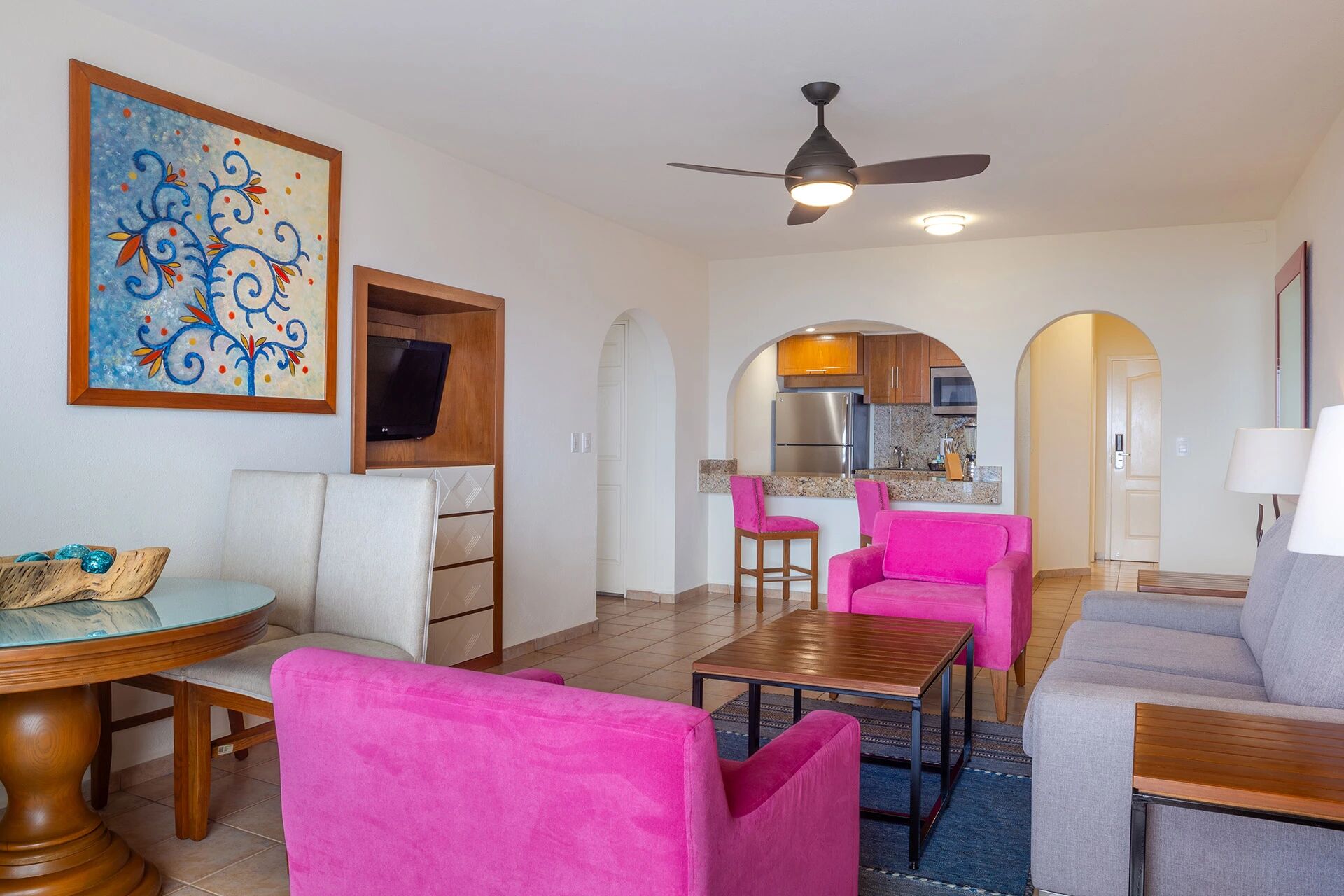 Accommodations range from spacious two- and three-bedroom suites to luxurious penthouse layouts, all designed with comfort and style in mind. Each unit includes a full kitchen or kitchenette, separate living and dining areas, private balcony or terrace (many with ocean or garden views), in-unit washer/dryer in select suites, and modern amenities like flat-screen TVs and Wi-Fi. The décor combines Mexican artisan touches with upscale finishes for a relaxed yet refined feel.