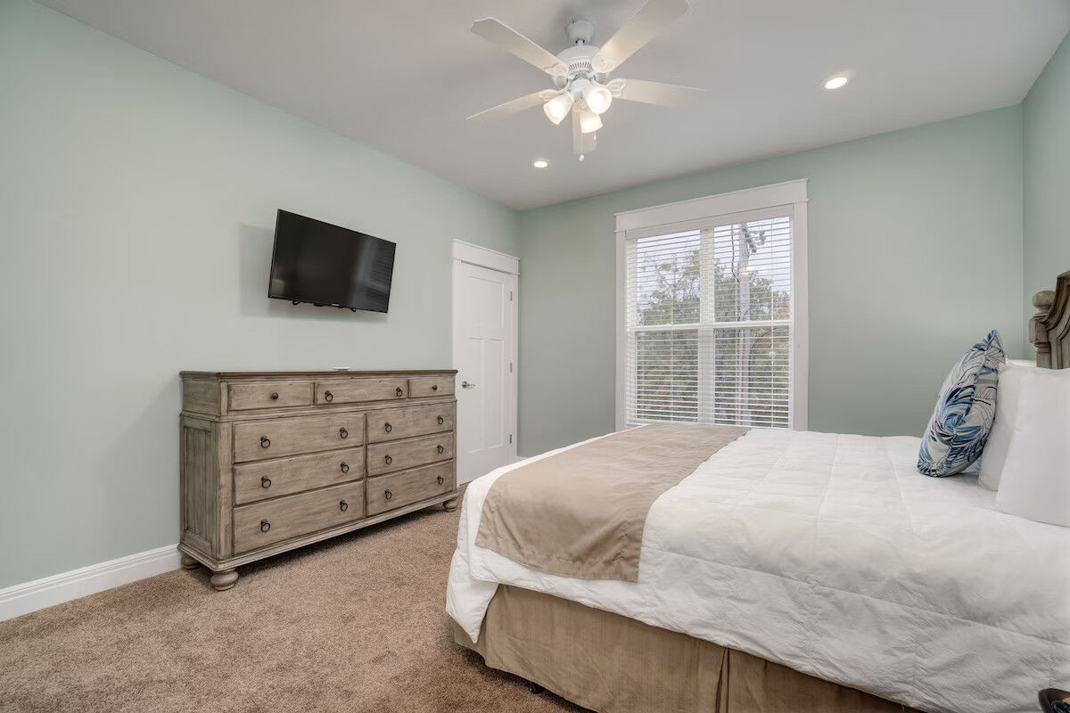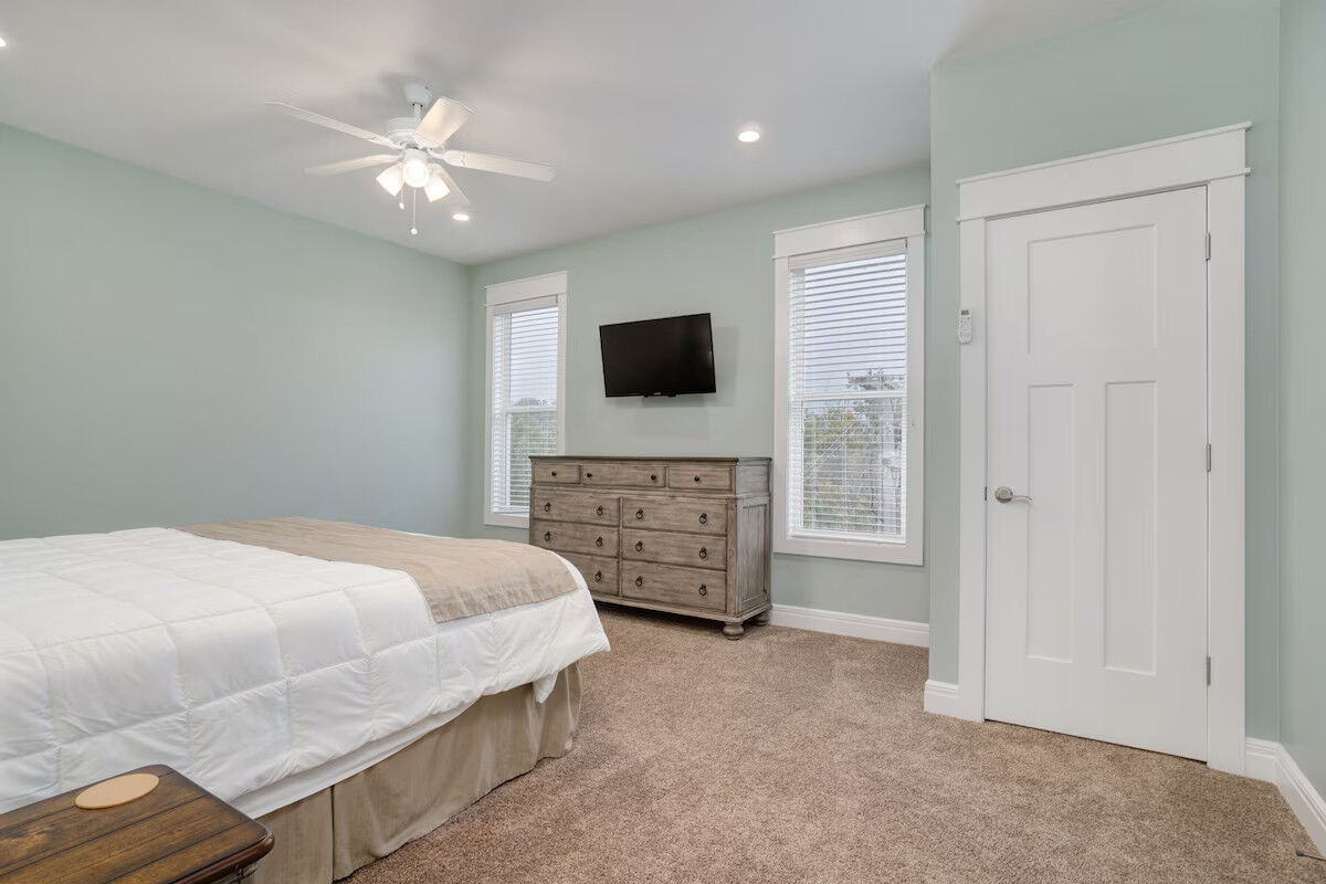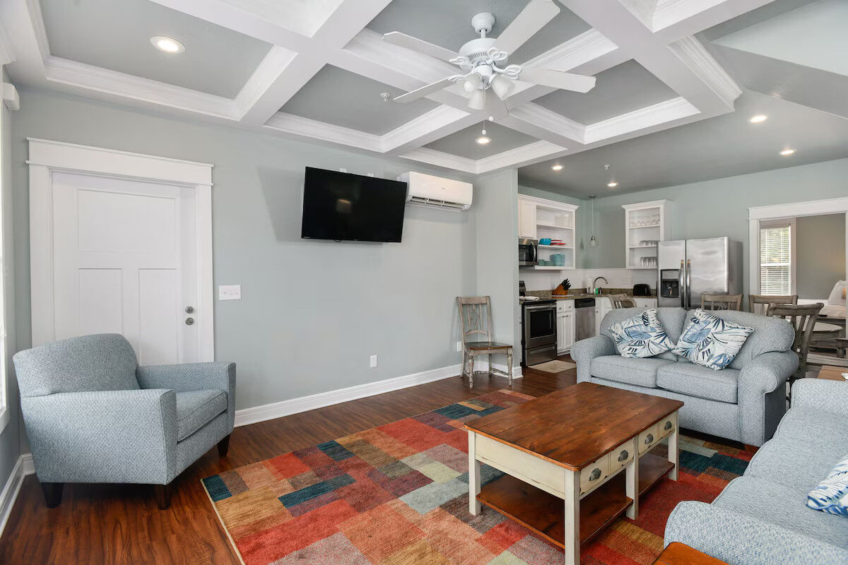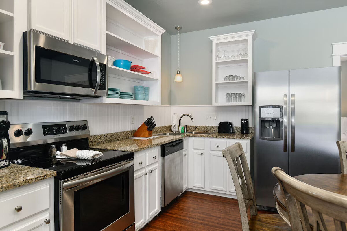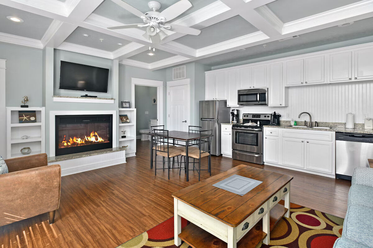 Accommodations range from studios to spacious three-bedroom villas, each equipped for comfortable extended stays. Units include fully-equipped kitchens, in-unit washer/dryer (in many layouts), electric fireplaces, private balconies or decks, HD flat-screen televisions, and free Wi-Fi. The décor blends rich wood tones and cozy textures with subtle nautical touches, creating a home-away-from-home atmosphere whether you’re staying for a weekend or longer.