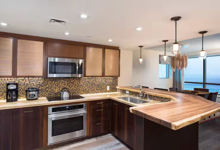 Suites are designed to feel like a home in paradise—with spacious one-, two- and three-bedroom suites plus luxurious penthouse units. Each has a full kitchen, separate living and dining areas, private balconies with views of the ocean, Waikiki, or the mountains, and modern conveniences like in-unit laundry, WiFi, and flat-screen TVs. The décor features locally inspired materials, artwork, and furnishings to give a relaxed Hawaiian vibe without sacrificing upscale finishes.