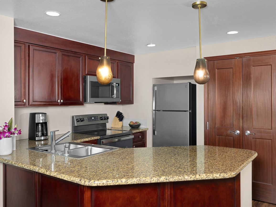 Marriott Ko Olina Beach Club villas capture the essence of Hawaiian plantation-style hospitality, blending elegance with comfort. Featuring beautiful Koa wood furnishings and authentic Hawaiian décor, each villa provides a perfect tropical retreat. Villas range from one to three bedrooms, offering a choice of stunning ocean views or scenic mountain views. Each villa includes a fully equipped kitchen with an oven, microwave, dishwasher, refrigerator, and essential cooking utensils. The master suite features a luxurious king-sized bed, an over-sized tub, and a separate shower. Guests can unwind in the spacious living and dining areas, complete with a queen sleeper sofa, TV, dining table, chairs, and a private lanai. For added convenience, each villa comes with a washer and dryer in the utility area.