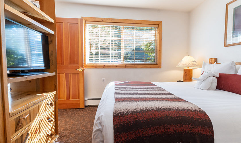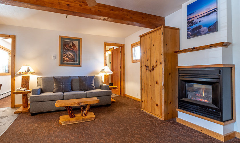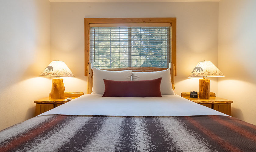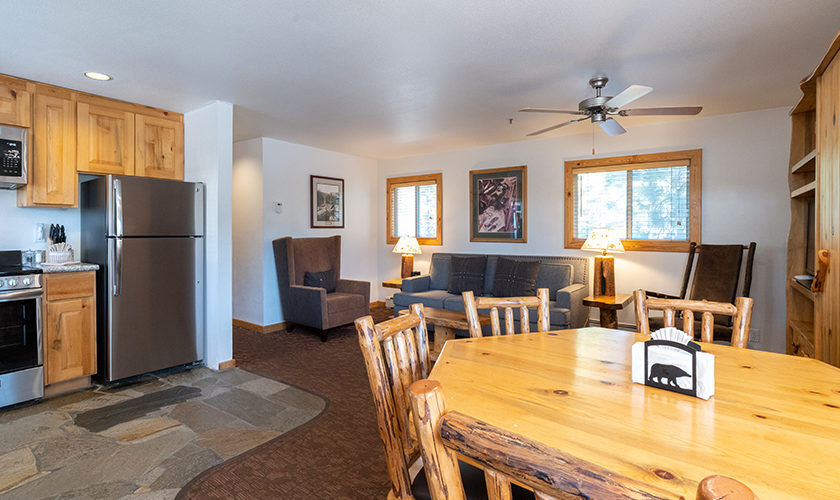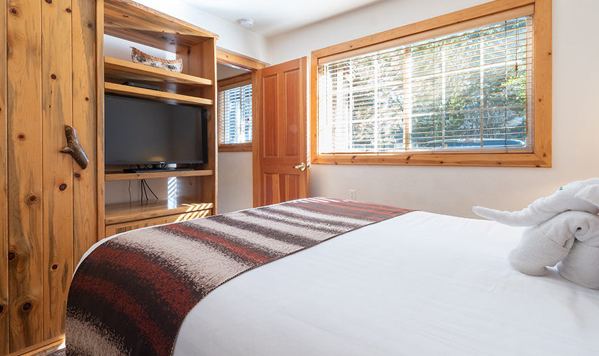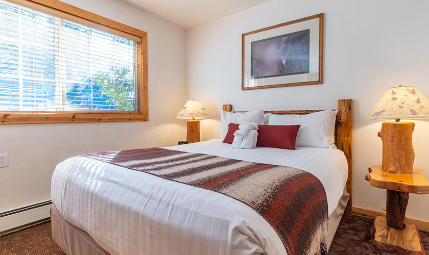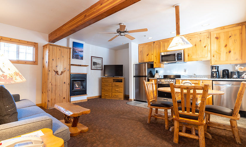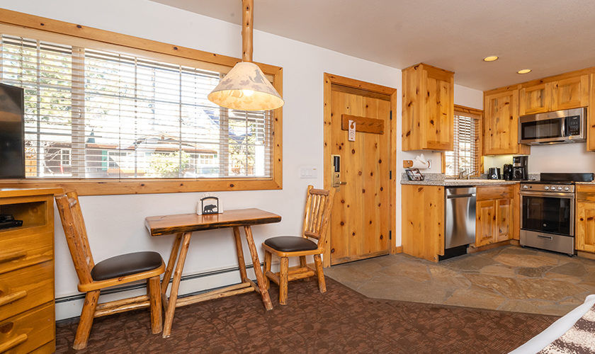 Red Wolf Lakeside Lodge offers studio, one and two-bedroom suites. Studio units sleep two and feature one bathroom, a queen Murphy bed, and kitchenette with dishwasher, microwave and refrigerator. One-bedroom units sleep four and feature one bathroom, a queen bed in the bedroom, a queen sleeper sofa in the living area and a kitchenette. Two-bedroom units sleep six and feature two bathrooms, a queen bed in both bedrooms and a full size kitchen. Of course, each room is decked out with warm woods and alpine theming to capture the Tahoe spirit.