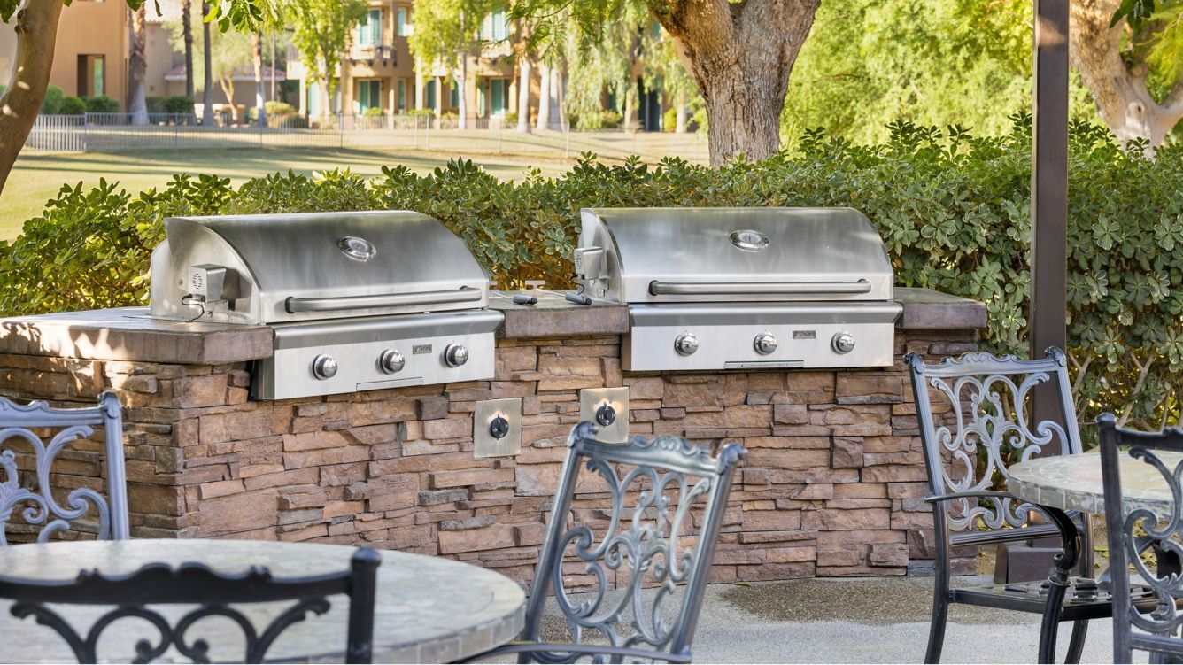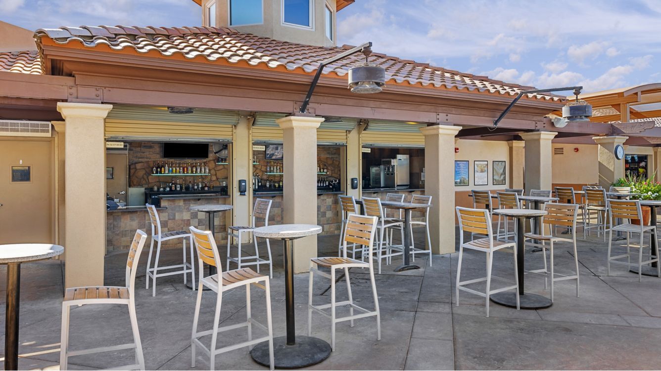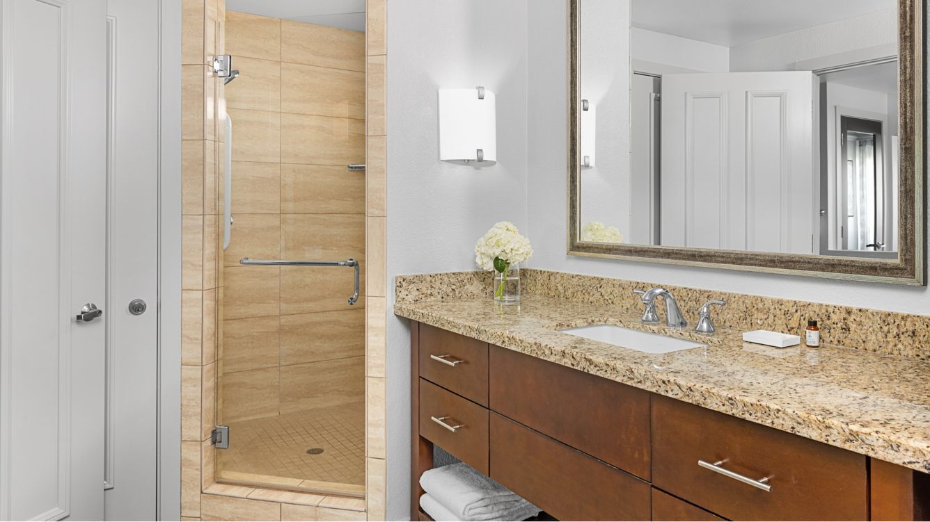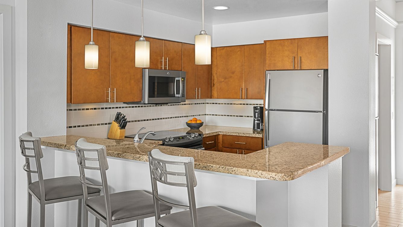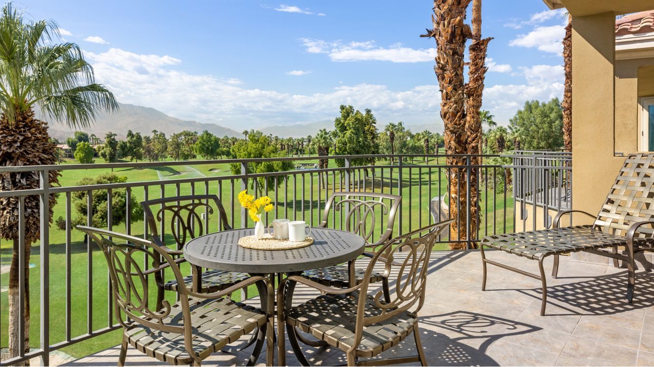 The elegantly appointed villas at Marriott's Desert Springs Villas II range from stylish studios to spacious two-bedroom accommodations, designed to provide a sophisticated residential experience in the California desert. Each villa features a full or partial with granite countertops and stainless steel appliances, designer furnishings, and a private furnished balcony or patio overlooking the lush desert landscaping. Modern amenities include premium bedding, oversized soaking tubs in master bathrooms, flat-panel HDTVs with streaming capabilities, complimentary high-speed Wi-Fi, and in-villa washers and dryers.