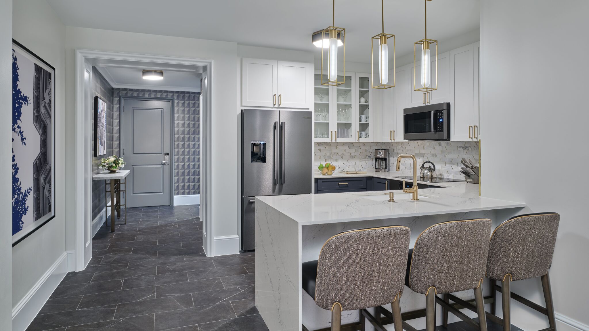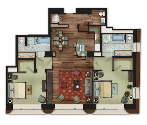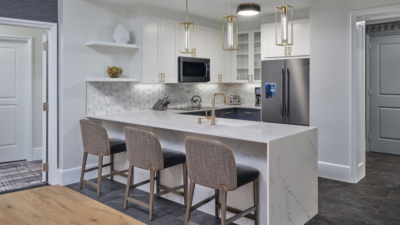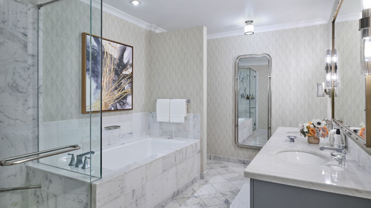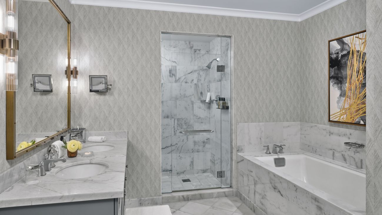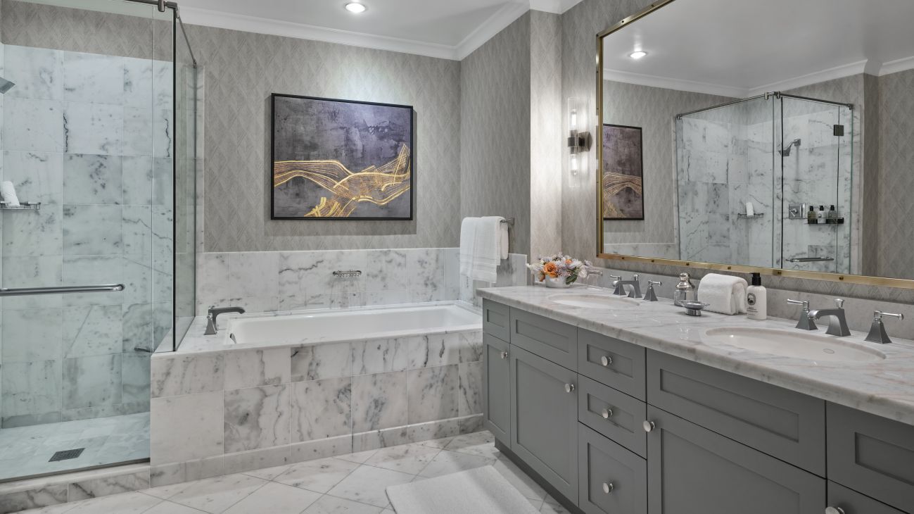 All of the Ritz-Carlton residences are luxuriously furnished, featuring fine appointments as top-of-the-line appliances, Italian marble bathroom floors and upscale lighting and fixtures throughout. Decor in shades of steely blue, silver and grey with roman shades and modern furniture pieces lend a relaxing yet refined atmosphere to your one, two or three-bedroom residence.
