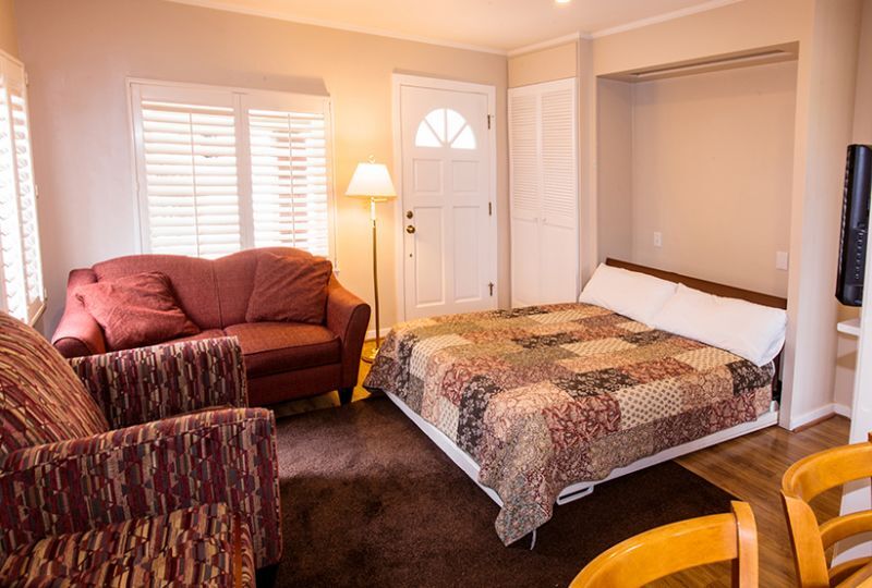 Pine Acres Lodge's seventeen units range from small, cozy studios to a two-bedroom townhomes big enough to accommodate four to six guests. Studio units include a kitchenette, king Murphy bed, a flat panel TV with a built-in DVD player, small gas fireplace and a roomy sitting area. The larger units include extra- plush touches like full kitchens, dining area, decks and even hot tubs!