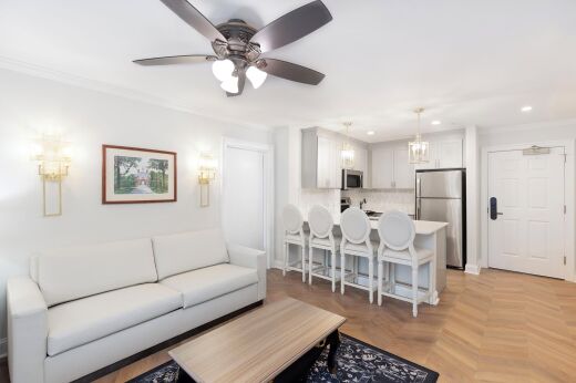 In addition to 850 square feet of space and room for up to six guests, the spacious Two-Bedroom Villa features a king bed in the master bedroom, a queen bed in the second bedroom, a sleeper sofa in the main living space, and a fully equipped kitchen.
