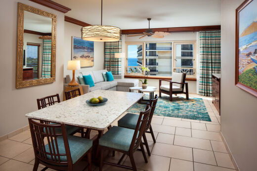 The Lahaina Tower at Marriott's Maui Ocean Club features spacious one, two, and three-bedroom suites designed with contemporary Hawaiian elegance. Each unit offers a fully equipped kitchenette or kitchen with granite countertops, and private lanais showcasing spectacular ocean, island and garden views. Villas also include roomy living and dining areas to offer additional space to unwind. Modern amenities include plush bedding with premium linens, oversized soaking tubs in master bathrooms, flat-screen TVs with premium cable, complimentary high-speed Wi-Fi, and in-suite washers and dryers.