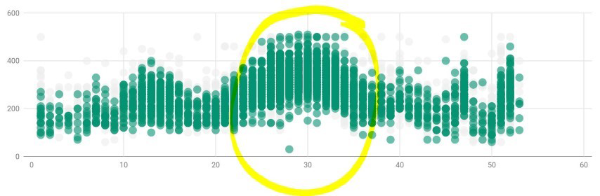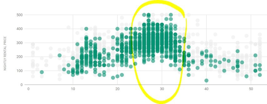 Notice there aren't any really bad times to book — the median price at time of writing is currently $270/night. But, clearly the spikes are weeks 25 - 34... late June - August. This is a summer hot spot.